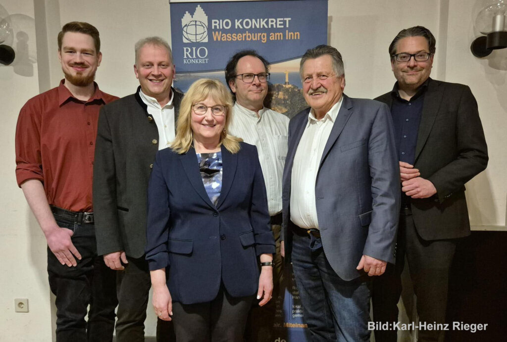 Von links: Milan Matijević (Kandidat der Linken Liste), Georg Gäch (Kandidat des Wasserburger Blocks), Heike Duczek (vom OVB – Moderation), Robert Obermayer (Vorstand Rio-Konkret), Josef Baumann (Kandidat der Freien Wähler Reitmehring-Wasserburg) und Bastian Wernthaler (parteiloser Kandidat von CSU, SPD, Grünen und Bürgerforum).